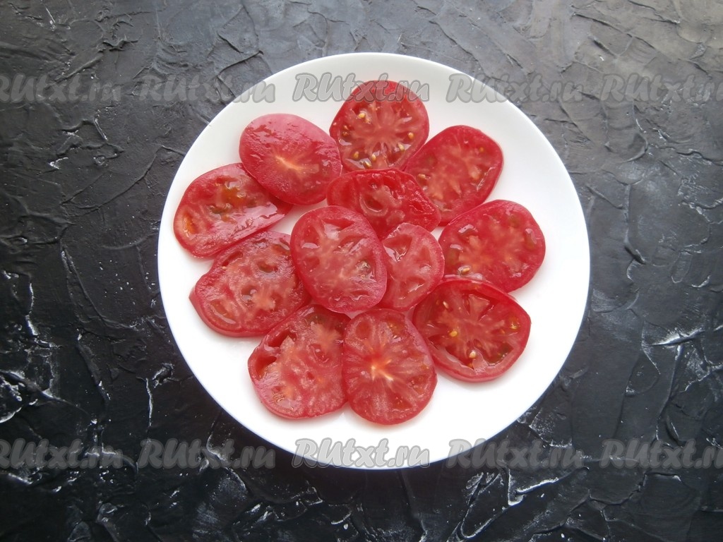 Нарезать свежие крепкие помидоры на кружочки толщиной, примерно, 0,5 см, затем выложить их в один слой на тарелку.