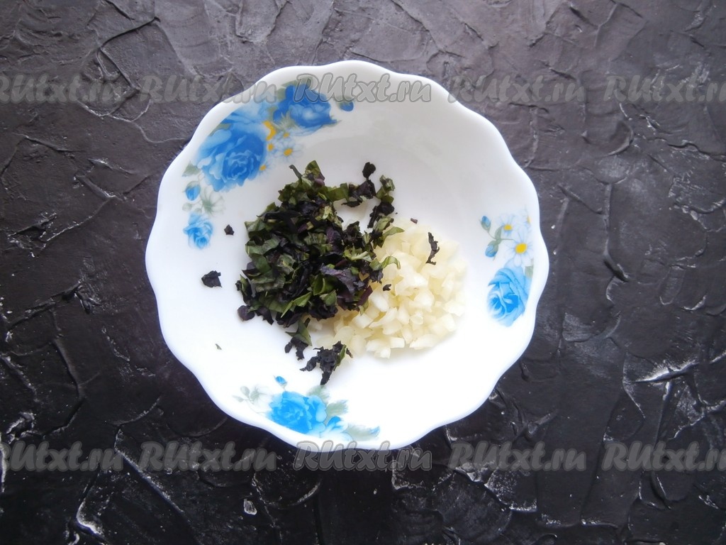 Листья базилика мелко нарезать, болгарский перец, очищенный от семян, нарезать на очень маленькие кубики, выложить в тарелку.