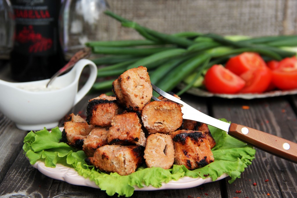 Нежный, сочный шашлык из свинины, приготовленный в маринаде из гранатового сока на мангале, подать к столу в горячем виде, дополнив овощами, зеленью и любимым соусом.