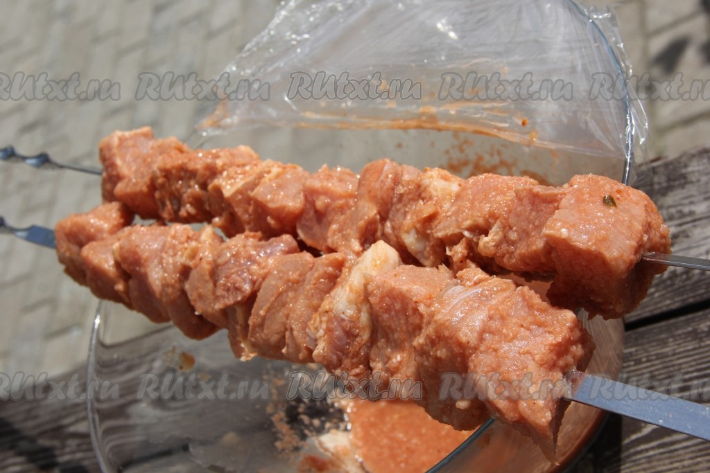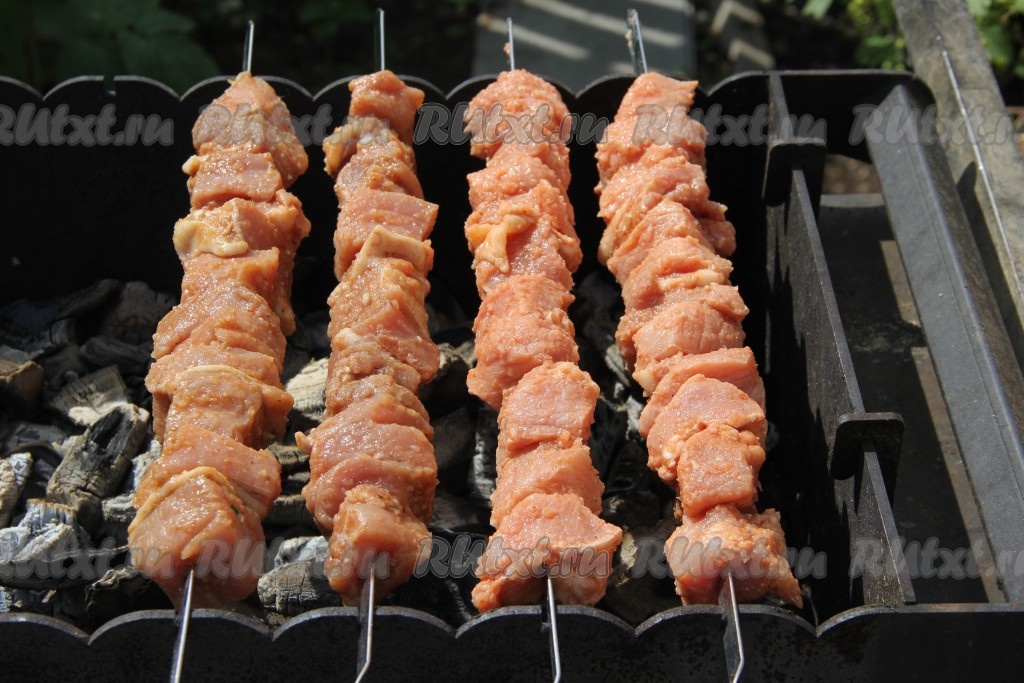 Подготовить мангал, хорошо раскалив угли. Жарить шашлык из свинины, периодически переворачивая, на мангале без прямого огня, используя только жар углей. Продолжительность приготовления во многом зависит от жара углей (обычно кусочки мяса готовы минут через 25-30). Готовность шашлыка можно проверить, надрезав кусочек свинины, если крови нет и мясо без розового оттенка - значит пора снимать с мангала и подавать к столу.
