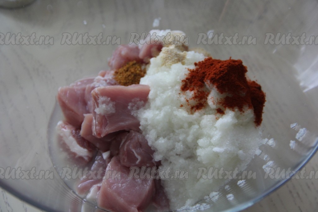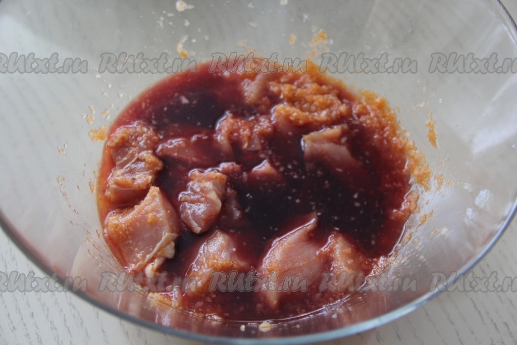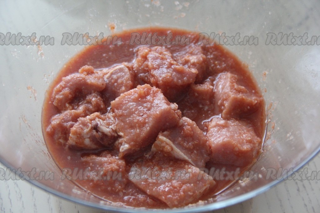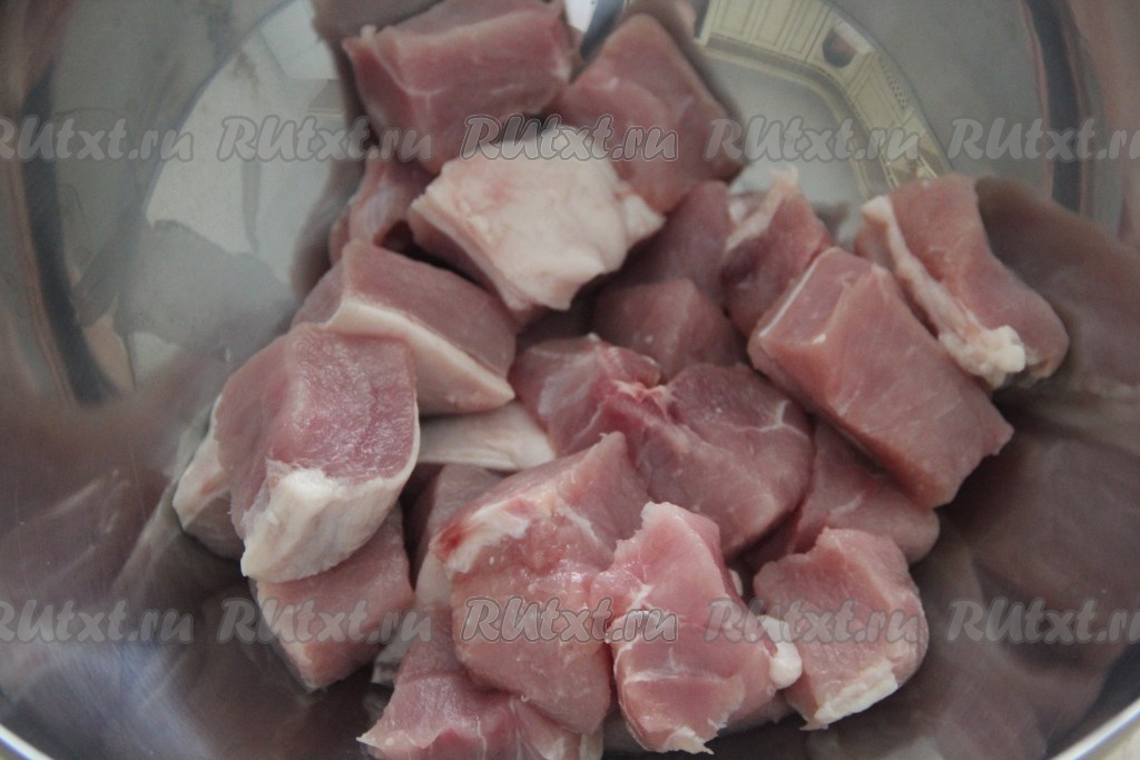 Нарезать мякоть свинины на кусочки размером, примерно, 3 сантиметра на 4 сантиметра, выложить в глубокую миску.