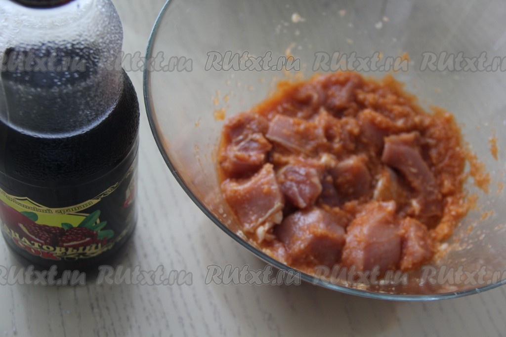 Перемешать и оставить свинину в гранатовом соке мариноваться на 3-10 часов в прохладном месте. Я убрала мясо в холодильник на ночь.