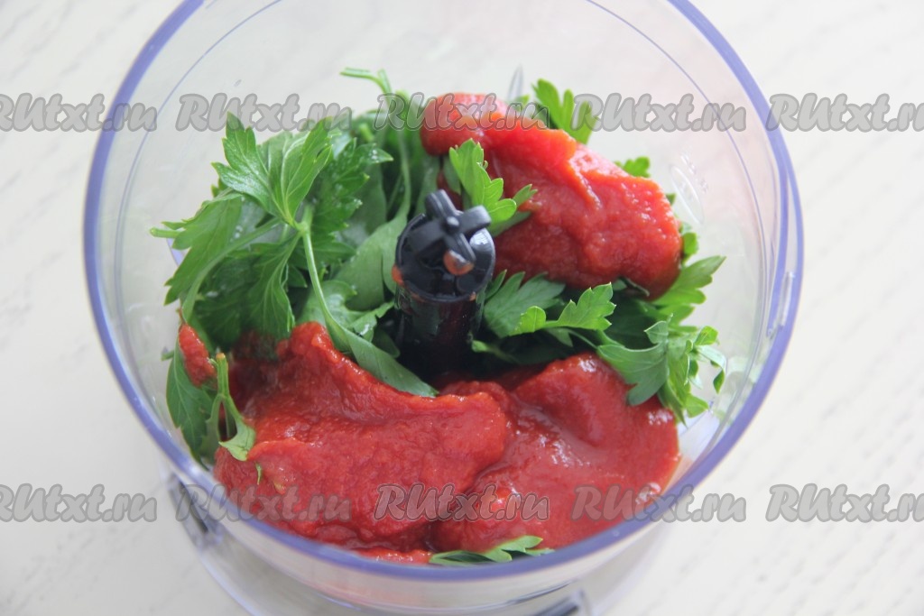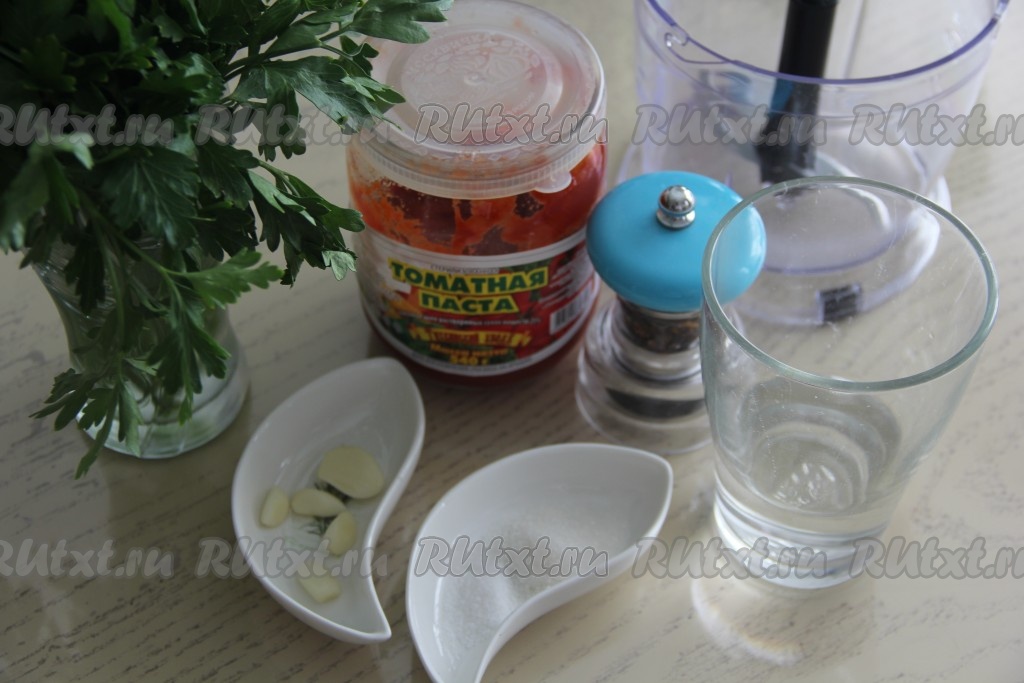В измельчитель выложить петрушку, зубчики чеснока, соль, сахар, чёрный молотый перец, влить воду и масло.