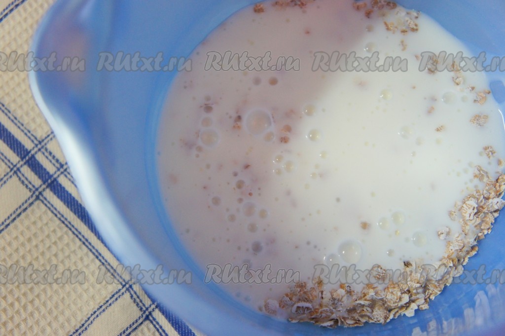 Добавить к хлопьям кефир. Дать постоять 10 минут. Хлопья должны разбухнуть немного.