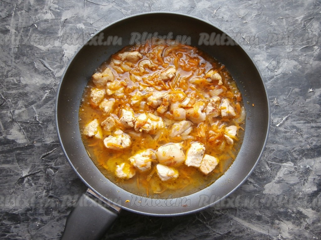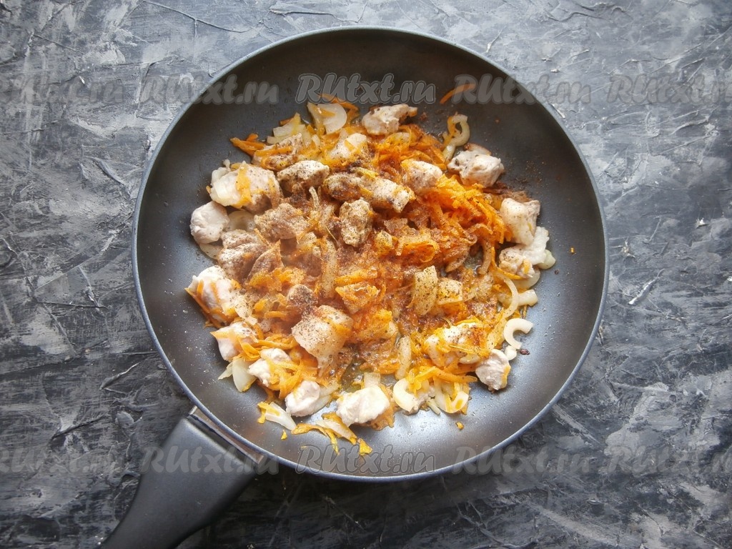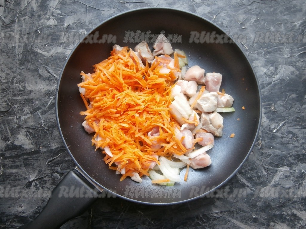 Мясо обжарить в течение 3-4 минут, иногда перемешивая, на среднем огне, затем добавить нарезанный произвольно лук и натёртую на крупной тёрке морковку.