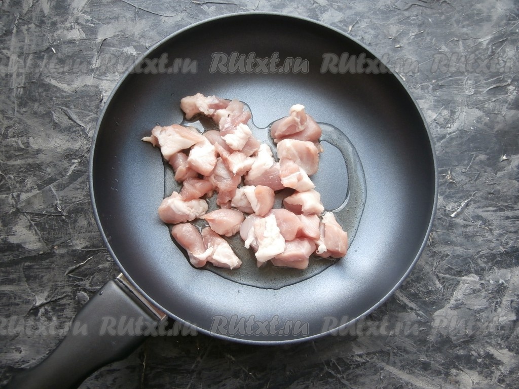 Луковицу, зубчик чеснока и морковку очистить, из болгарского перца удалить семена. Мясо (у меня свинина) нарезать небольшими кусочками, поместить в сковороду с растительным маслом.