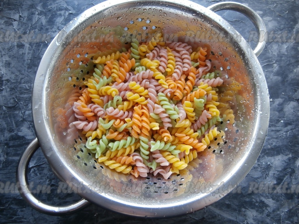 В кастрюлю с кипящей подсоленной водой выложить макароны, после закипания, убавив огонь, отварить их до готовности (продолжительность варки указана в инструкции к макаронным изделиям на упаковке), затем переложить их на дуршлаг, дать стечь воде.