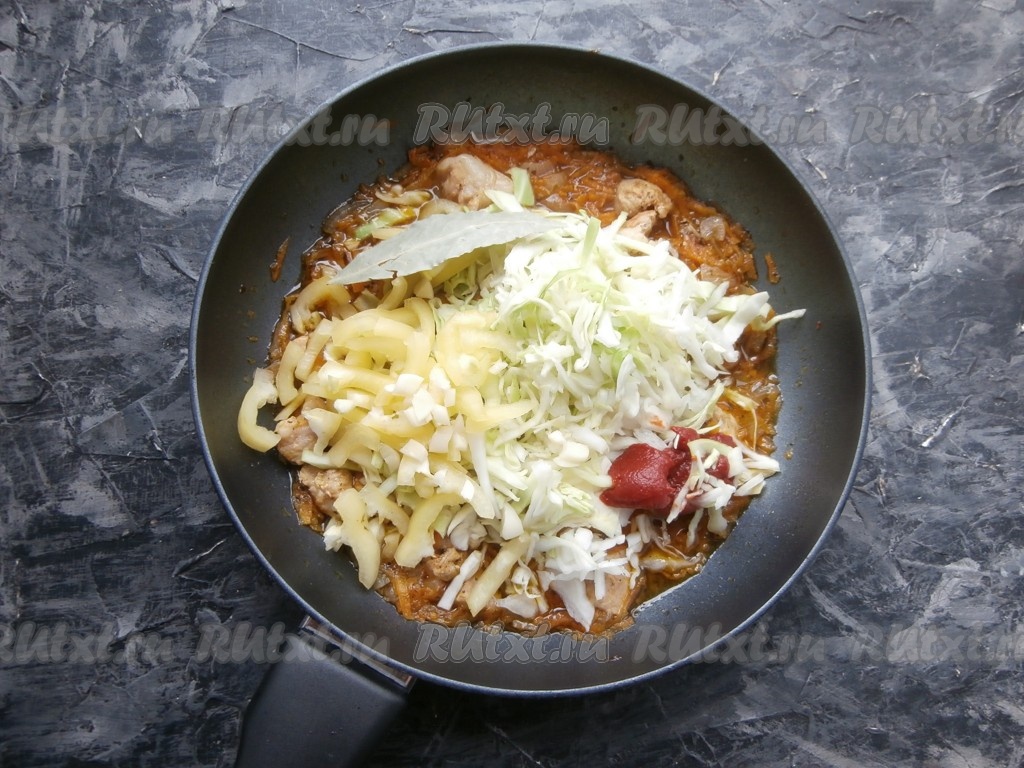 По прошествии времени добавить к мясу нашинкованную капусту, томатную пасту, нарезанный соломкой болгарский перец (по желанию), измельчённый чеснок и лавровый лист, перемешать, протушить на небольшом огне 10-15 минут (до мягкости капусты).