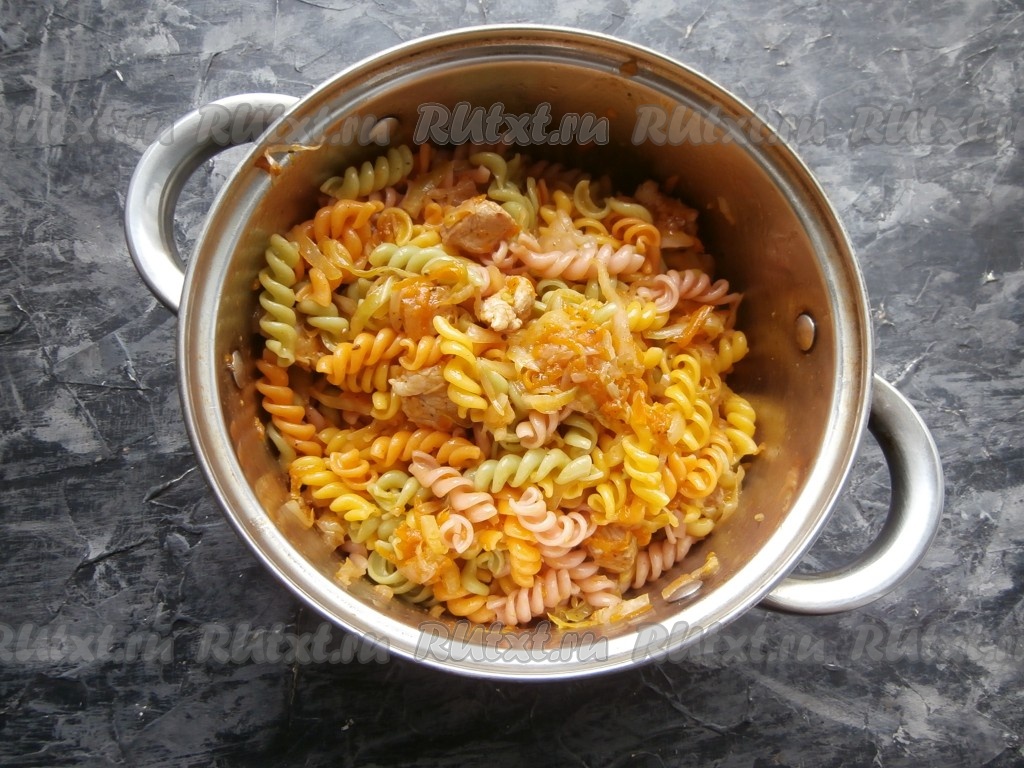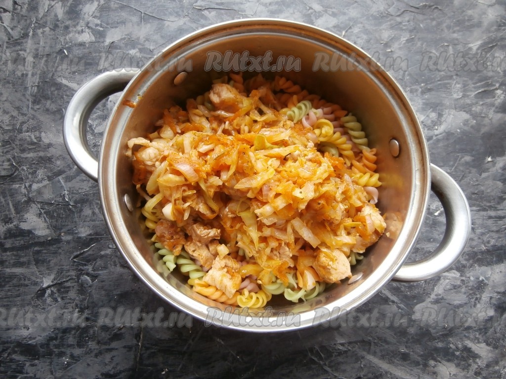 Далее макароны переложить в кастрюлю, добавить туда же мясо с капустой.