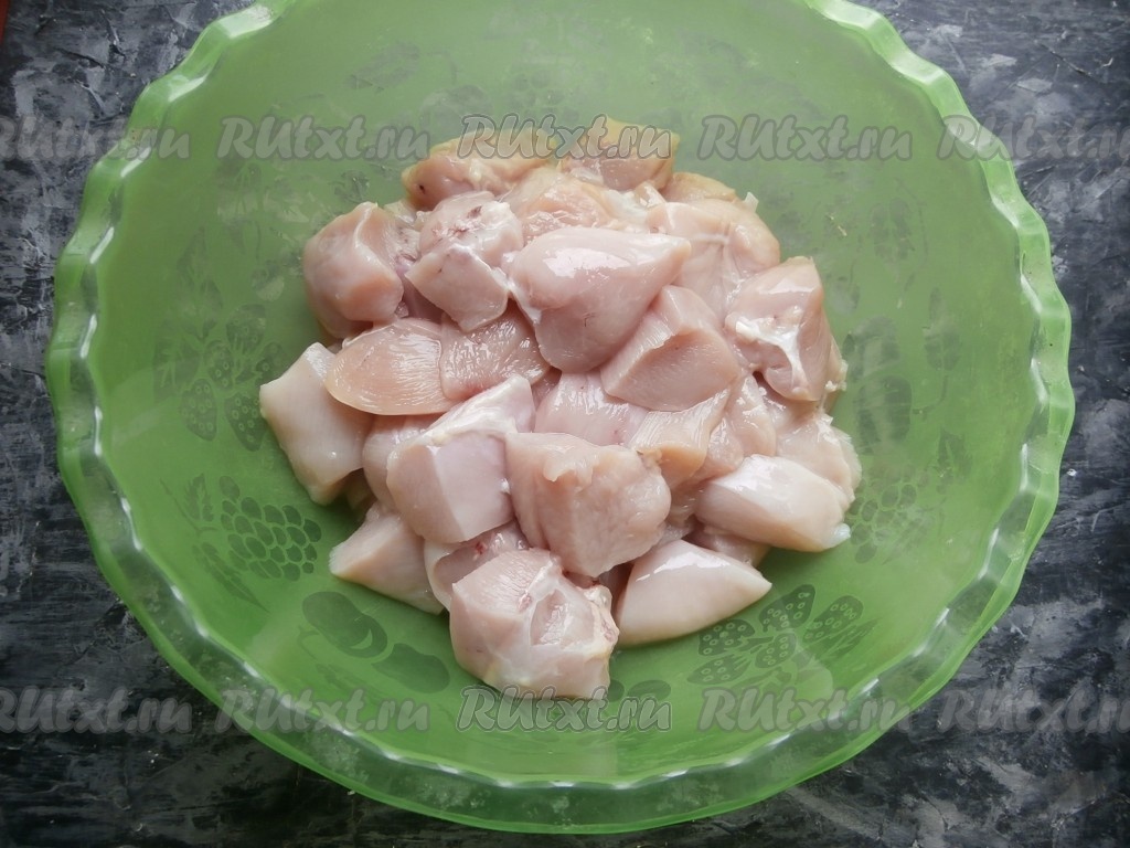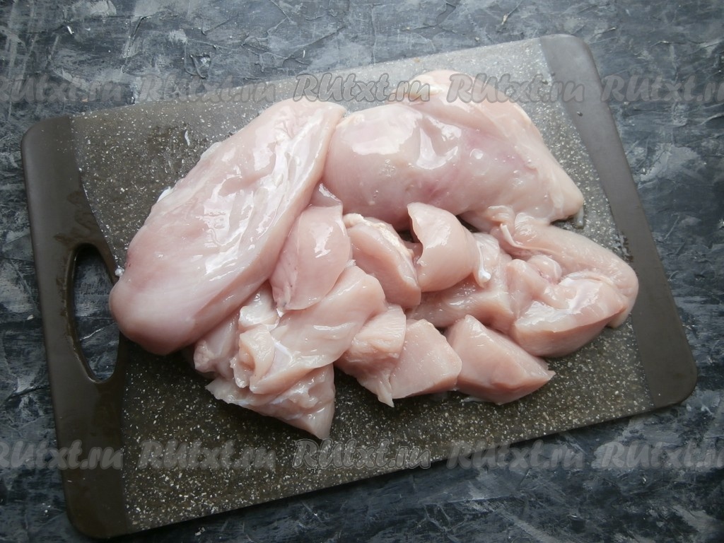 Куриное филе промыть, обсушить. Нарезать средними кусками, как обычно вы режете мясо на шашлык.