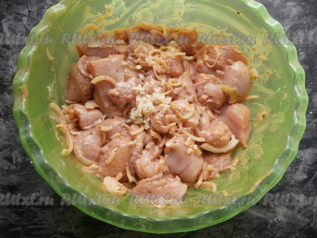 Лук нарезать тонкими полукольцами, добавить к куриному филе. Лук, пока он находится сверху, хорошо помять руками, соединяя его со специями. Далее всё хорошо перемешать, добавить пропущенный через пресс чеснок. Кусочки курицы помять в течение 2-3 минут. Оставить курицу в прохладном месте для маринования минимум на 3 часа (лучше на ночь).