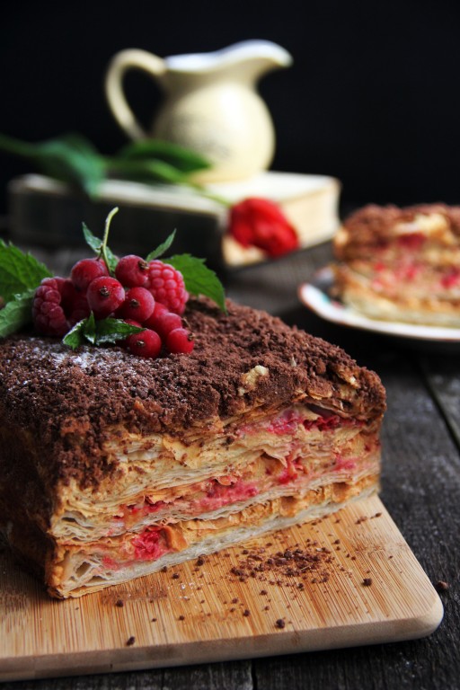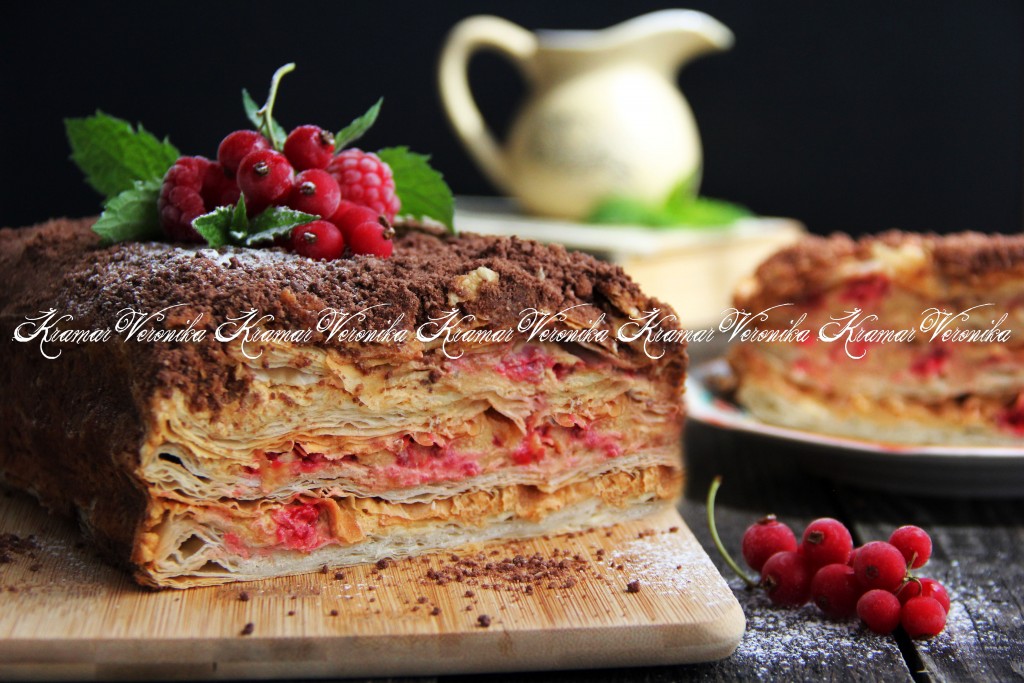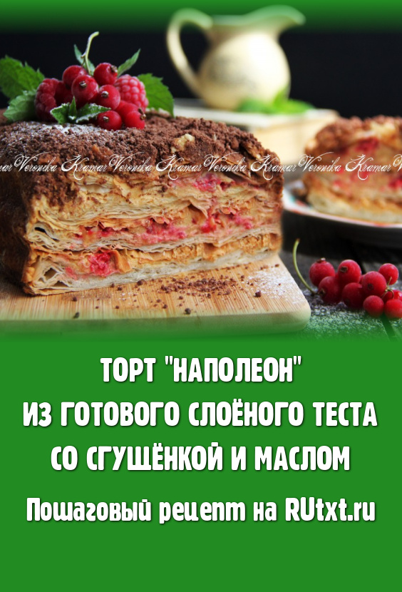 Если вы не любите возиться с тестом или на это просто нет времени, можно приготовить торт "Наполеон" с коржами из готового (покупного) слоёного теста с кремом из варёной сгущёнки, сливочного масла и сметаны. Очень важно этой выпечке, как и классическому "Наполеону", дать пропитаться в холодильнике не менее 8 часов. После пропитки торт из покупного слоёного теста получается нежным и очень вкусным. При желании, в крем можно добавить свежие ягоды (я добавила малину), которые придадут выпечке приятную ягодную нотку, но это необязательно. Торт "Наполеон", приготовленный по этому несложному рецепту, получается мягким, хорошо пропитанным, а значит он достойно украсит чаепитие в кругу друзей и близких!
