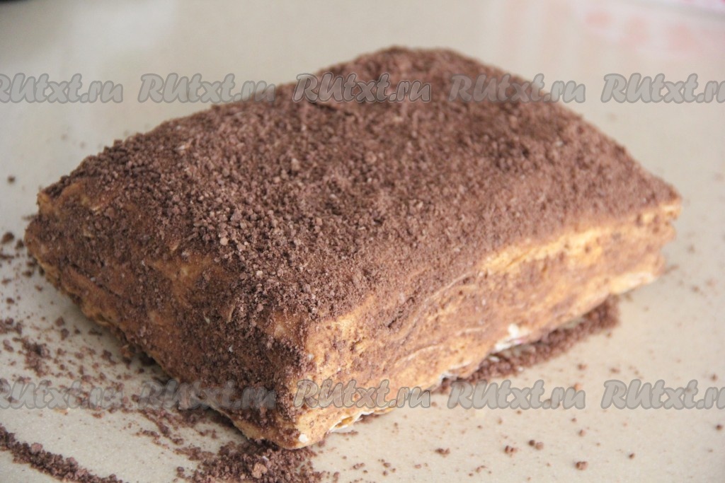 Перед подачей готовый слоёный торт "Наполеон" можно посыпать натёртым на тёрке шоколадном (или крошкой от печенья).