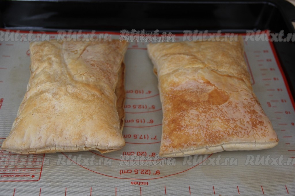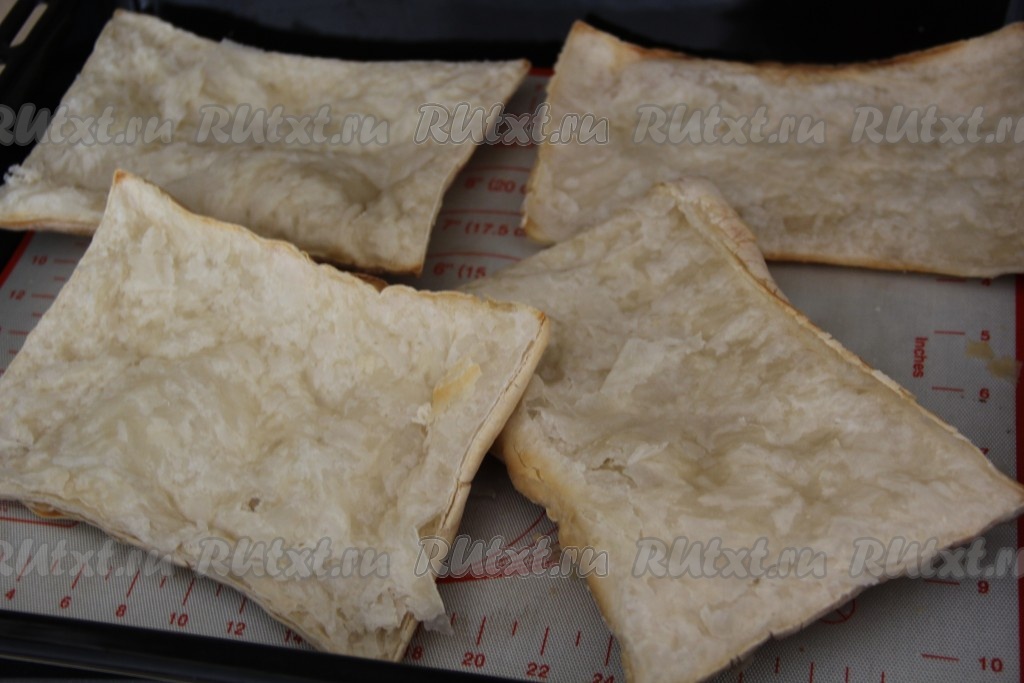 У меня слоёное тесто было в виде двух прямоугольных пластов. Тесто слегка раскатать скалкой, а затем переложить на противень, застеленный тефлоновым ковриком (или пекарской бумагой).
