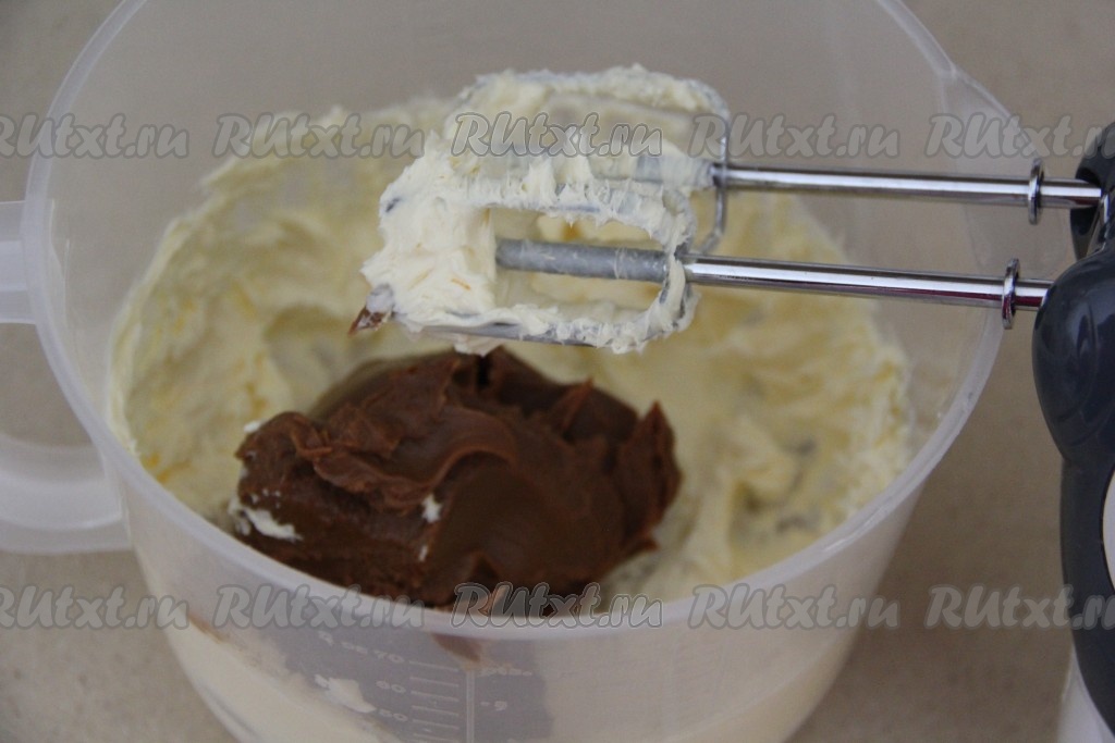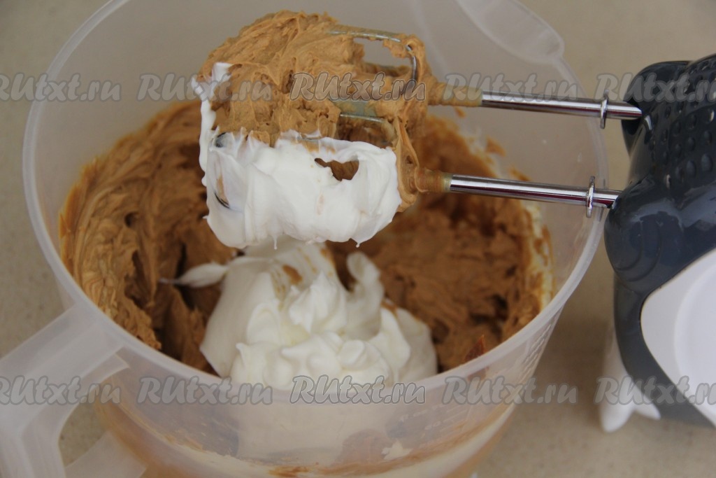 Теперь займёмся кремом для торта. Сливочное масло достаньте заранее, чтобы оно стало при комнатной температуре достаточно мягким. Взбить размягчённое масло в течение 5 минут миксером, затем добавить варёную сгущёнку.