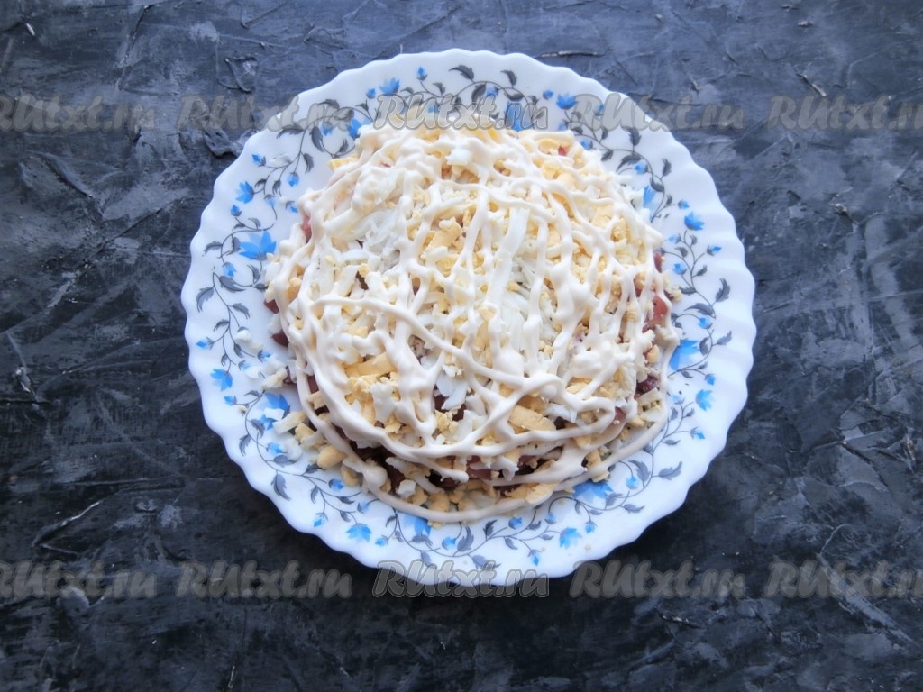 Яйца заранее отварить вкрутую (варим 8-10 минут с момента закипания), остудить, очистить, натереть на крупной тёрке и выложить следующим слоем, смазать сверху майонезом.