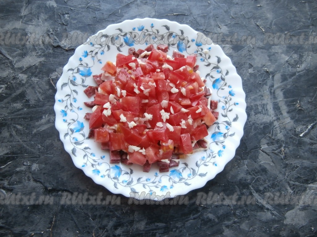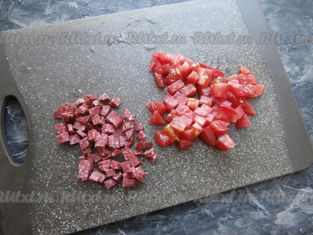Копчёную колбасу и 1 свежий помидор нарезать кубиками.
