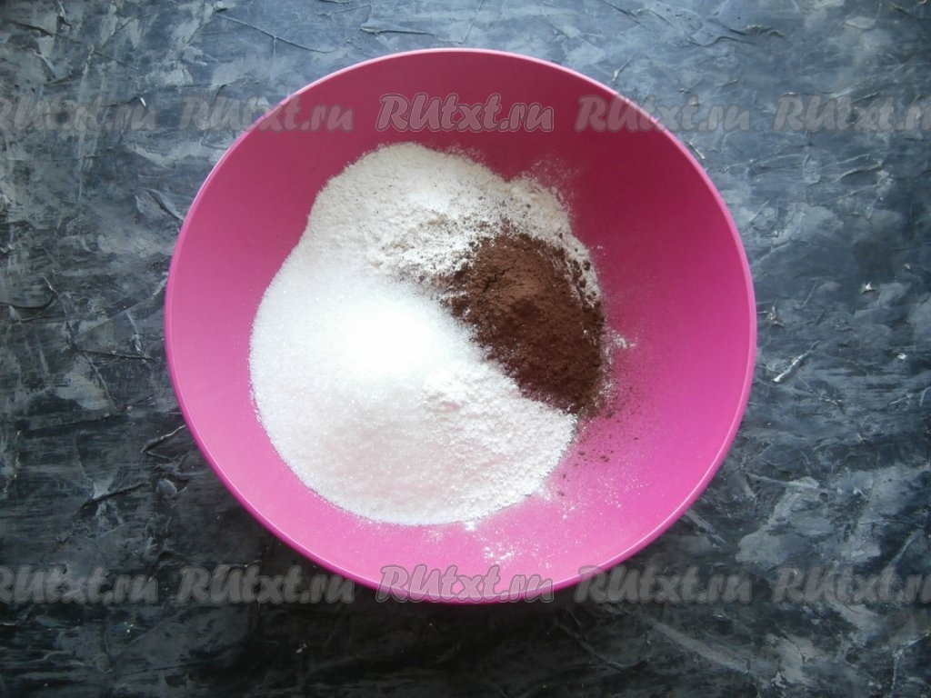 Вначале замесим тесто для коржей, для этого в миску нужно просеять муку, добавить соль, разрыхлитель, какао-порошок и сахар, перемешать.