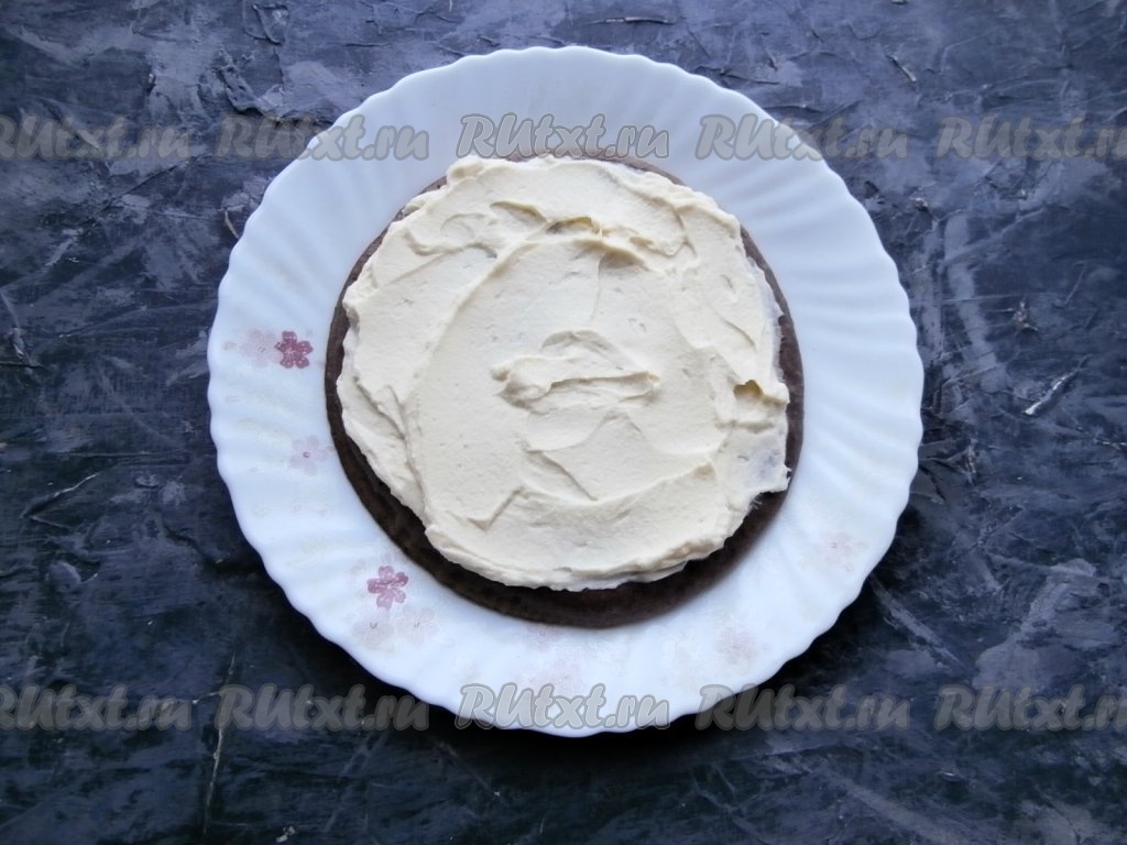 Сметанный крем охладить в холодильнике хотя бы 30 минут, а затем смазать им остывшие коржи, выкладывая их один на другой, формируя тортик.