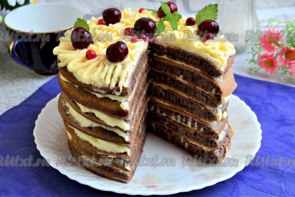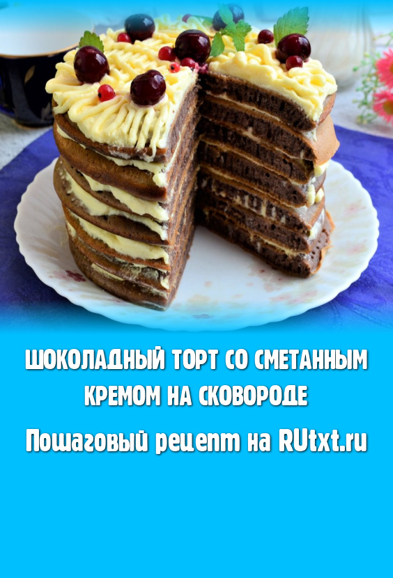 Верхний корж также смазать кремом, украсить (я украсила вишней, ягодами смородины и листиками мяты). Очень нежный, вкусный, мягкий шоколадный торт со сметанным кремом, приготовленный на сковороде, поместить в холодильник часа на 2-3.