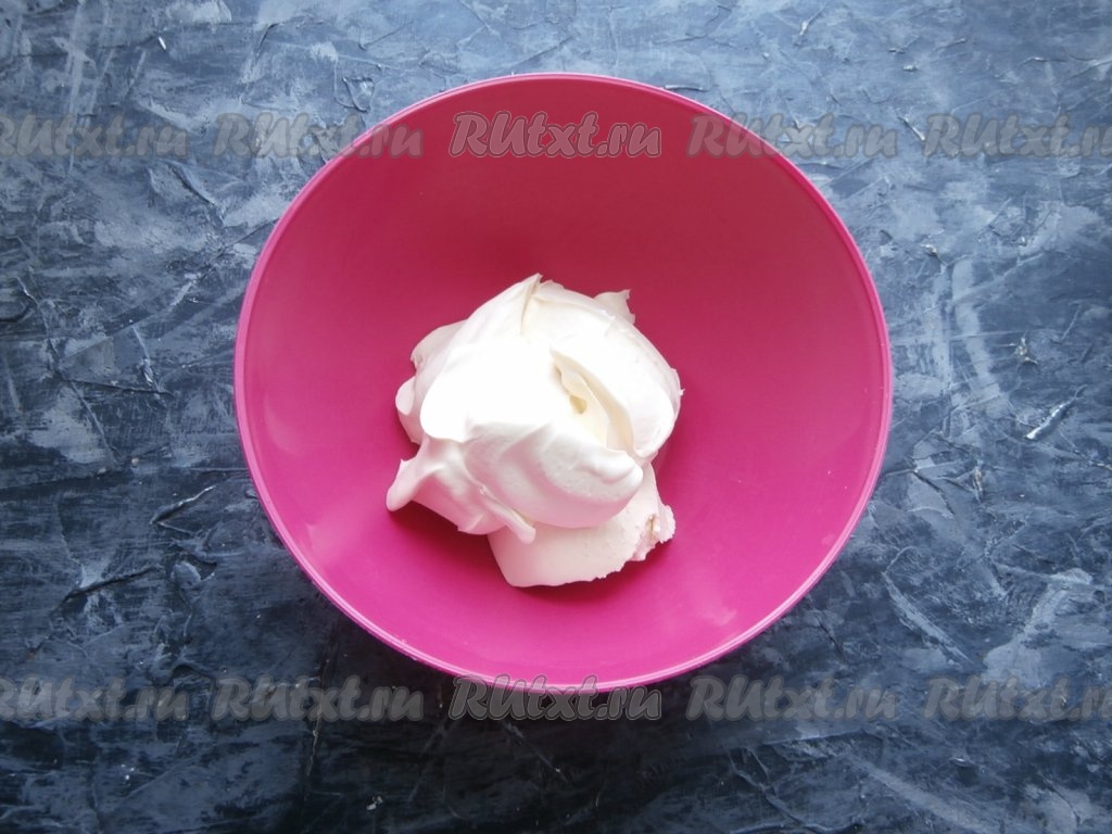 Коржи для торта полностью остудить, а пока они остывают, приготовить крем. Я готовила крем из домашней сметаны, которую нужно выложить в миску.