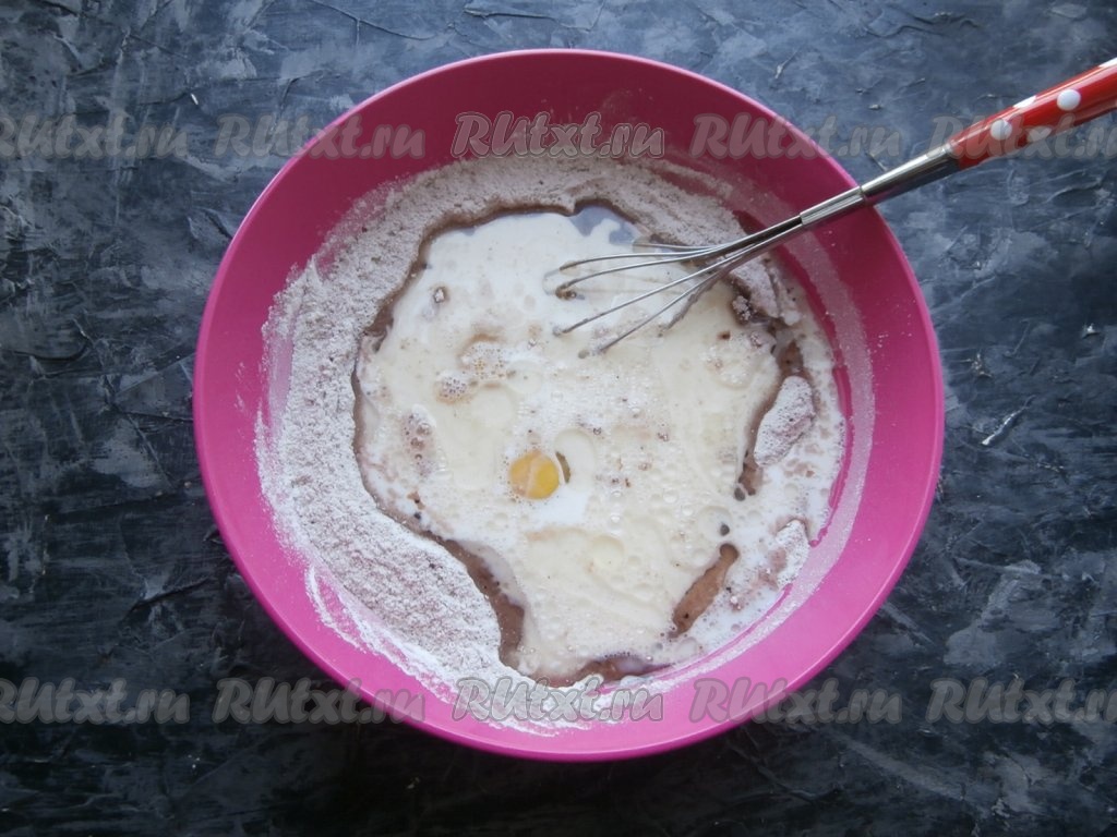 В получившуюся смесь влить молоко комнатной температуры, добавить растительное масло и сырые яйца.