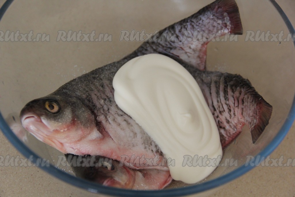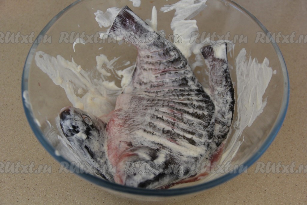 Обмазать рыбу майонезом со всех сторон и внутри. Оставить мариноваться на 30 минут.