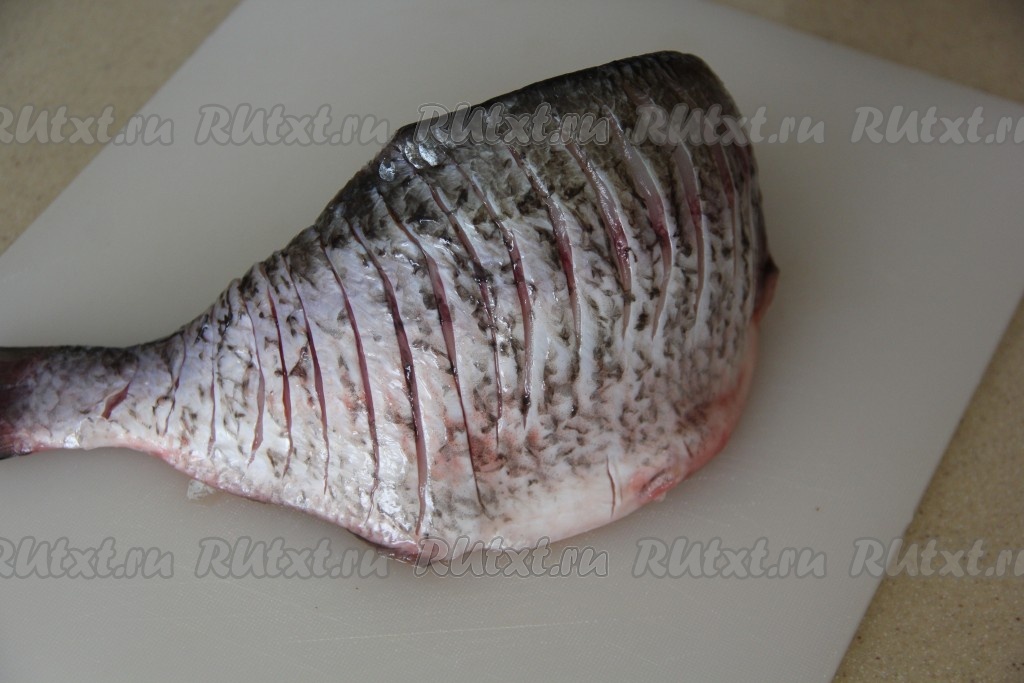 С помощью острого ножа сделать надрезы по всей поверхности леща с двух сторон. Лещ - рыба костлявая, а благодаря надрезам на рыбке мелкие косточки не будут чувствоваться после обжаривания на сковороде.