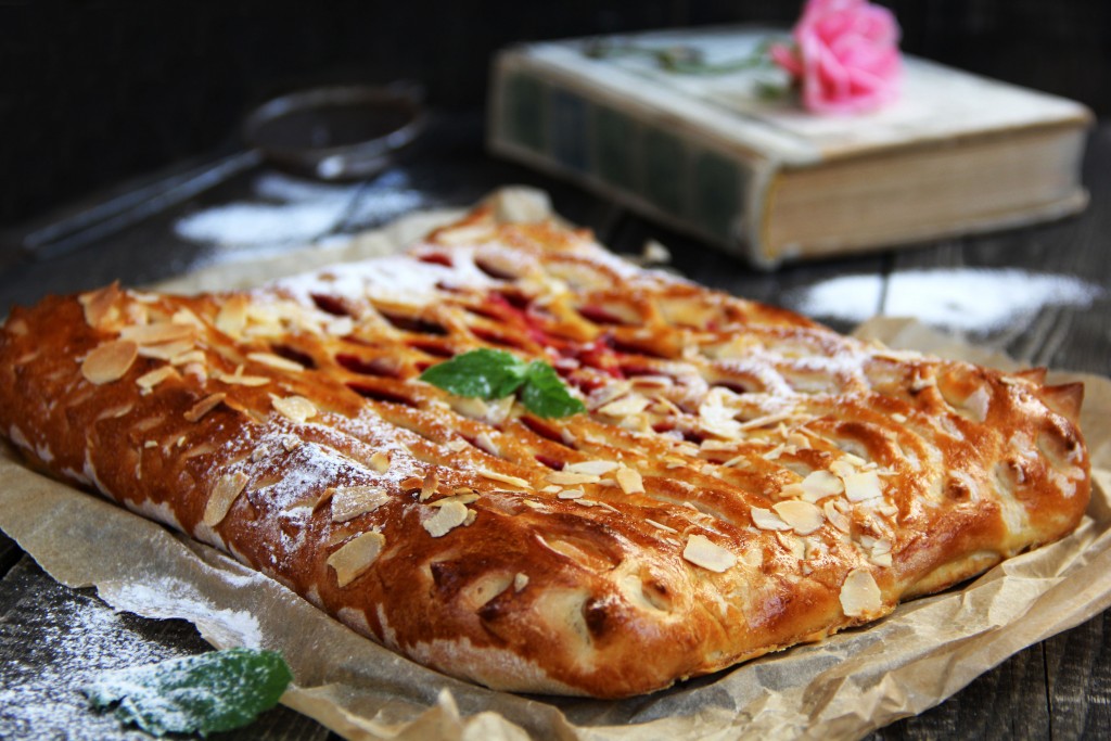 Смазать верх пирога взбитым желтком и присыпать, по желанию, лепестками миндаля.
