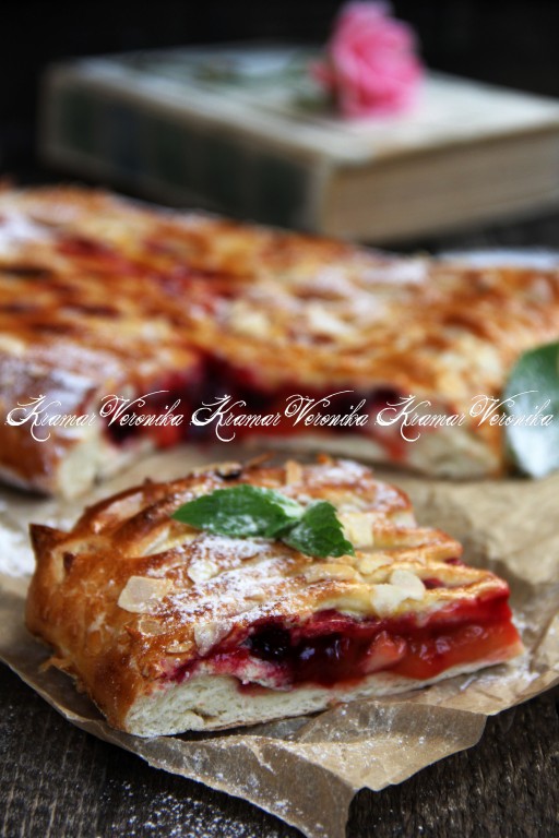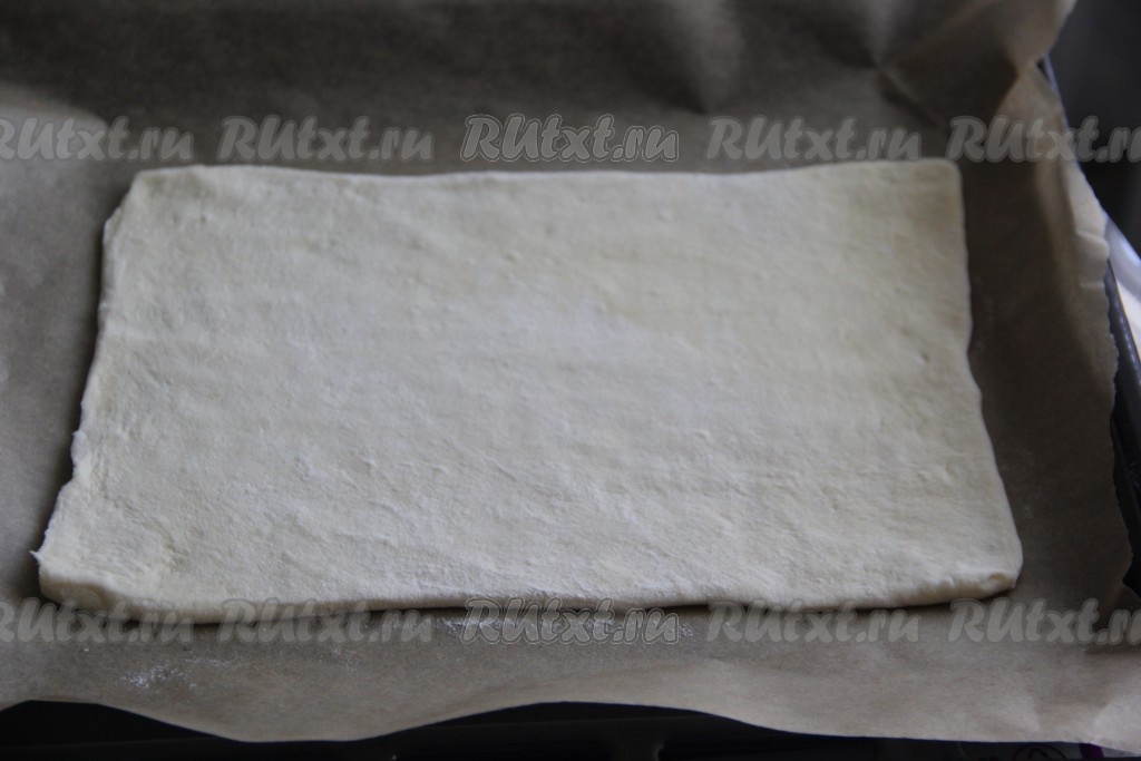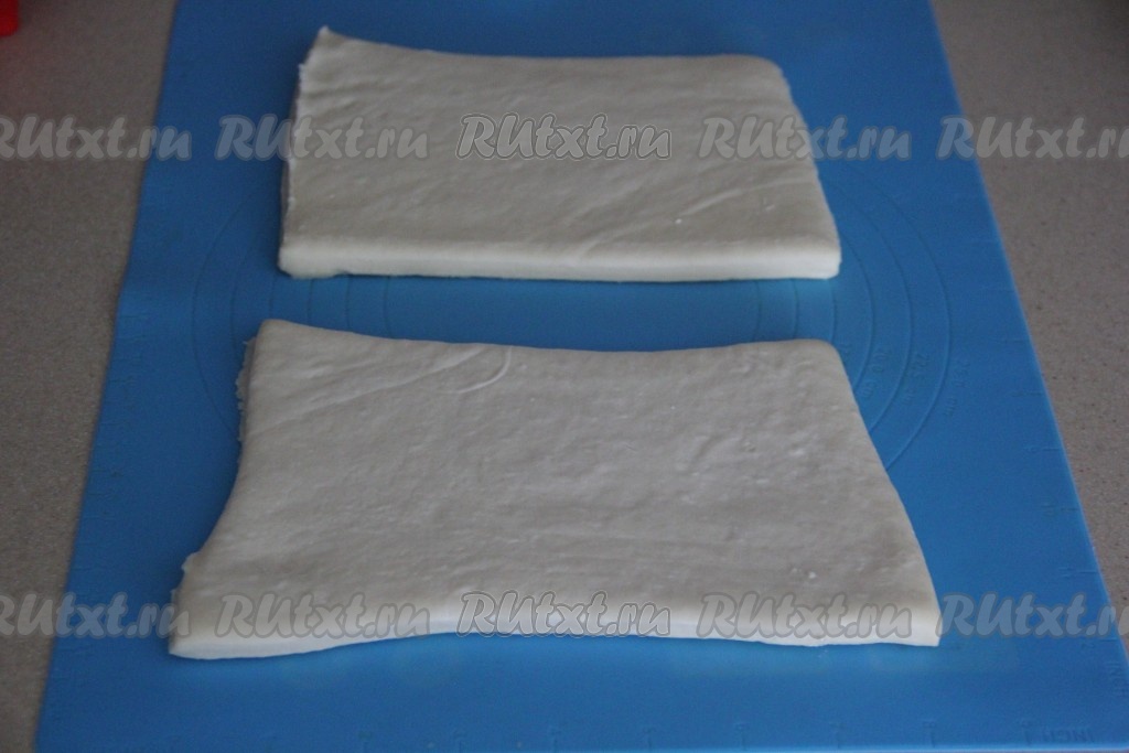 У меня тесто слоёное дрожжевое. Разморозить пласты теста при комнатной температуре.