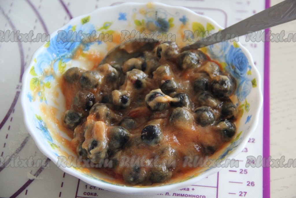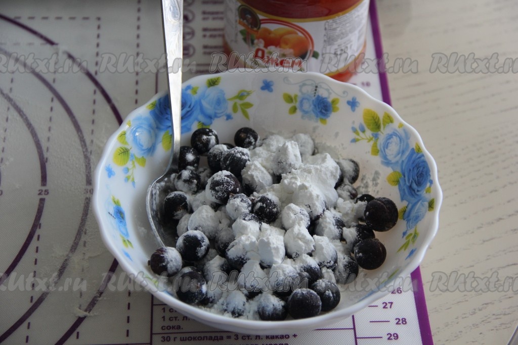 Чёрную смородину перебрать, удаляя порченые ягоды и веточки, затем промыть и обсушить. Если готовите, как я, с замороженной чёрной смородиной, можно ягодки не размораживать. Ягоды (свежие или замороженные) поместить в глубокую тарелку, всыпать к ним крахмал и перемешать.