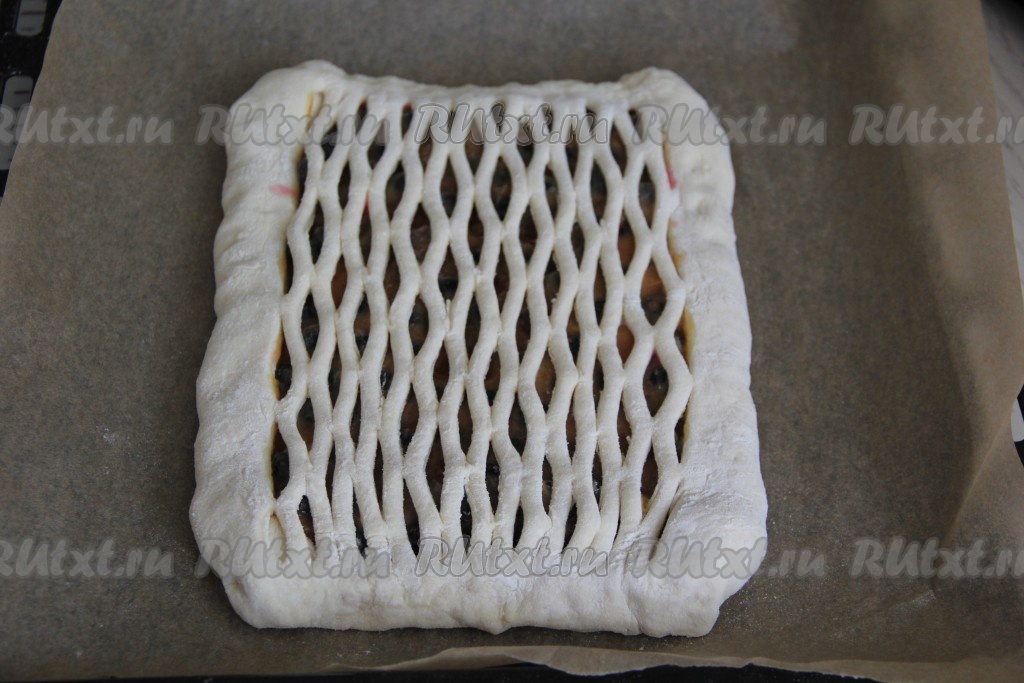 Выложить второй, фигурно нарезанный, пласт теста поверх пласта теста с начинкой и хорошо закрепить края.