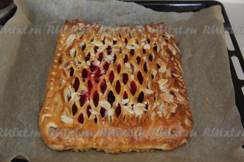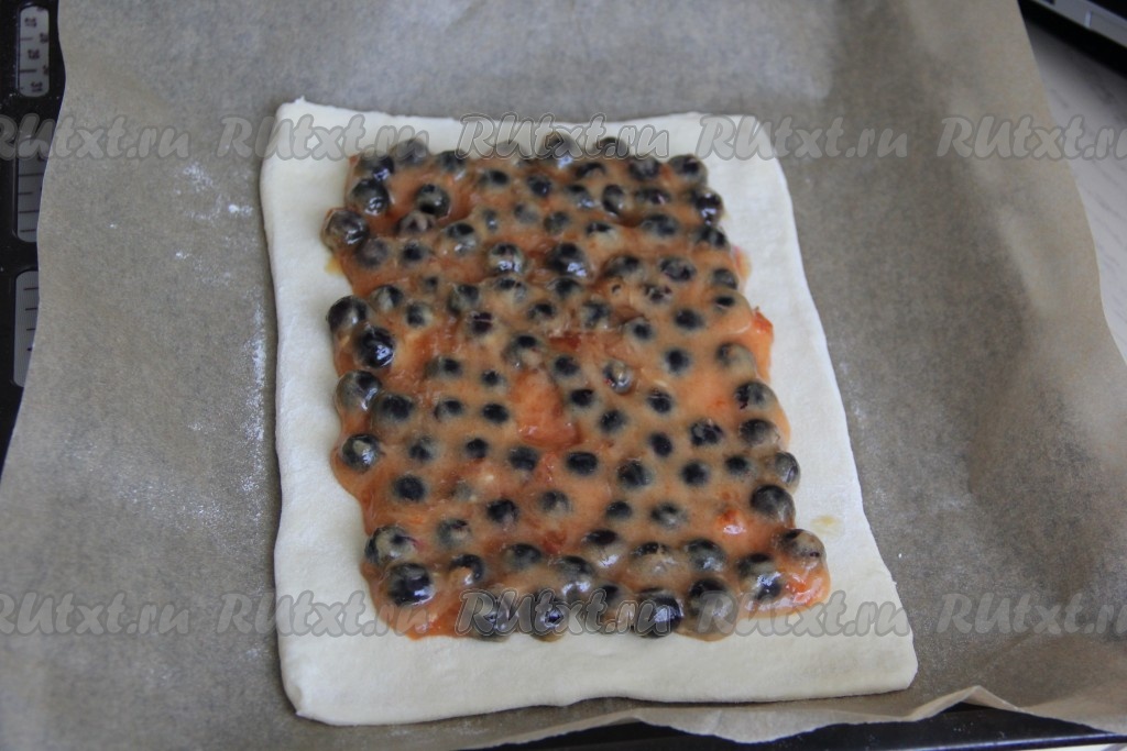 Выпекать пирог с чёрной смородиной минут 30-35 в духовке, предварительно разогретой до 200 градусов (слоёное тесто должно стать золотистого цвета). Готовую выпечку, достав из духовки, слегка остудить.