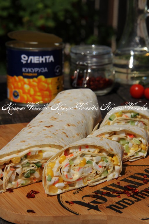 В качестве холодной закуски и к повседневному, и к праздничному столу можно приготовить очень вкусный, нежный, красивый в разрезе рулет из лаваша с аппетитной начинкой из крабовых палочек, свежего огурчика и кукурузы. Непосредственно на формирование рулета нужно совсем немного времени, а затем надо дать ему пропитаться и у вас на столе будет замечательная закуска, которая, наверняка, придётся по вкусу вам и вашим близким!