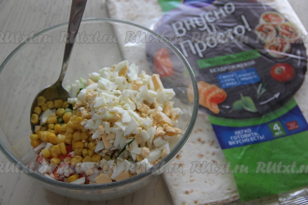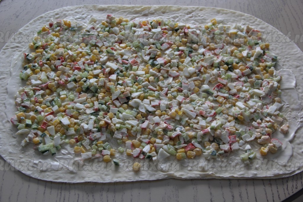 Салатную массу равномерно распределить по части лаваша, смазанной майонезом.