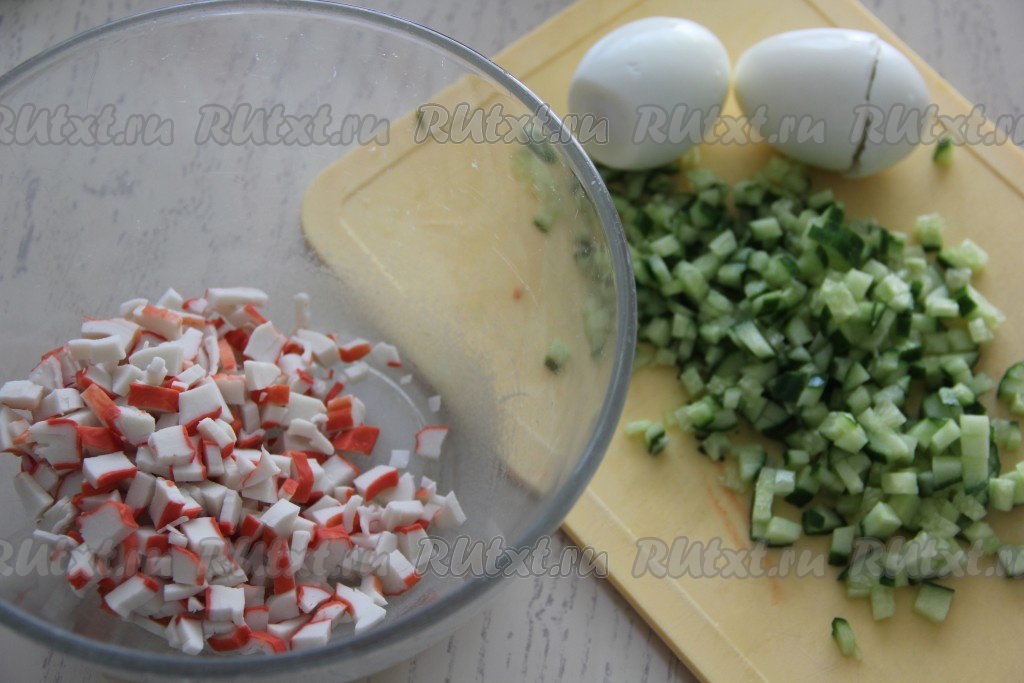 Яйца тоже нарезать на мелкие кубики и добавить в миску с огурчиками и крабовыми палочками.