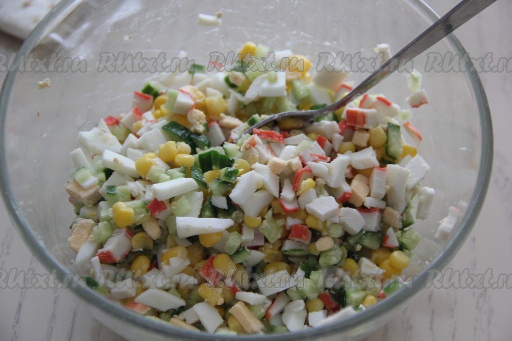 Вымытый огурец и размороженные крабовые палочки нарезать на мелкие кубики, сразу выложить в миску.