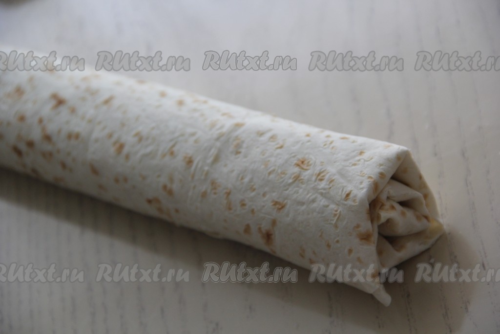Края лаваша с двух более узких сторон слегка подвернуть, а затем, начиная с широкой стороны, свернуть лаваш в достаточно плотный рулет, завернуть в фольгу и отправить на час в холодильник.