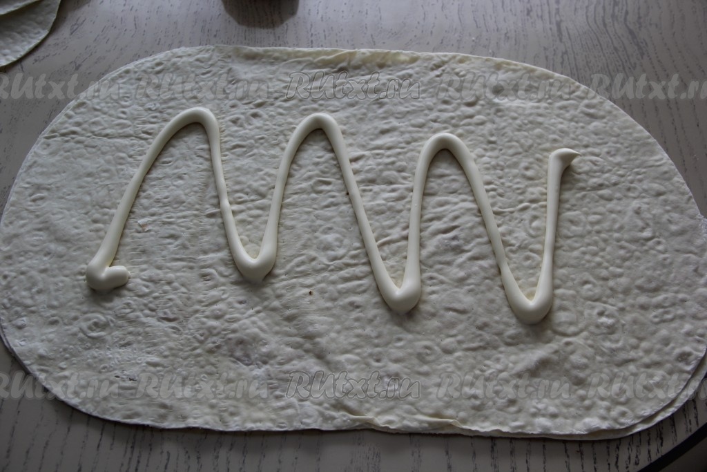 Нанести на лист лаваша майонез, затем равномерно размазать его по поверхности лаваша, оставляя чистыми края.