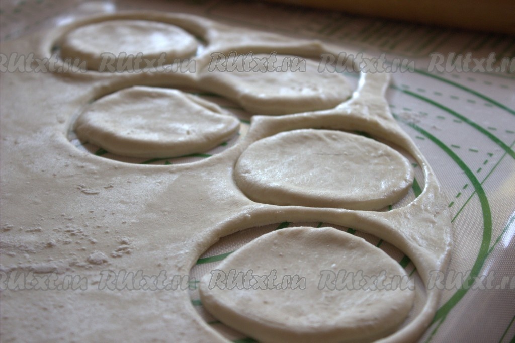 Рабочую поверхность припылить мукой, раскатать тесто в тонкий пласт. Вырезать круги диаметром 8-10 сантиметров. Вырезать кружки можно с помощью чашки соответствующего размера.