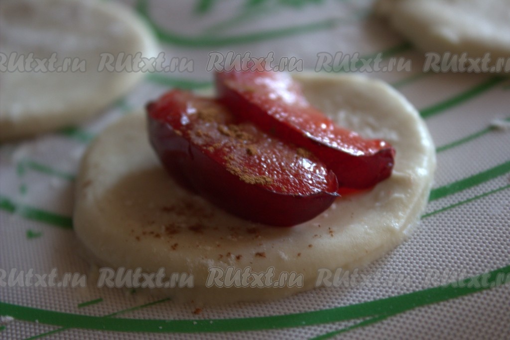 В центр каждого круга выложить 3-4 дольки слив, добавить по 1/2 чайной ложки сахара и, при желании, посыпать корицей.