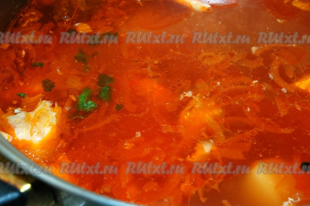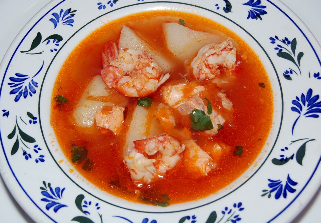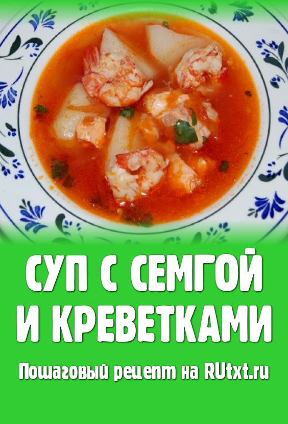 В бульон с картофелем отправить мясо семги, отделенное от костей, лук с томатом и креветки. Добавить лавровый лист, соль, перец. Через 10 минут рыбный суп готов.