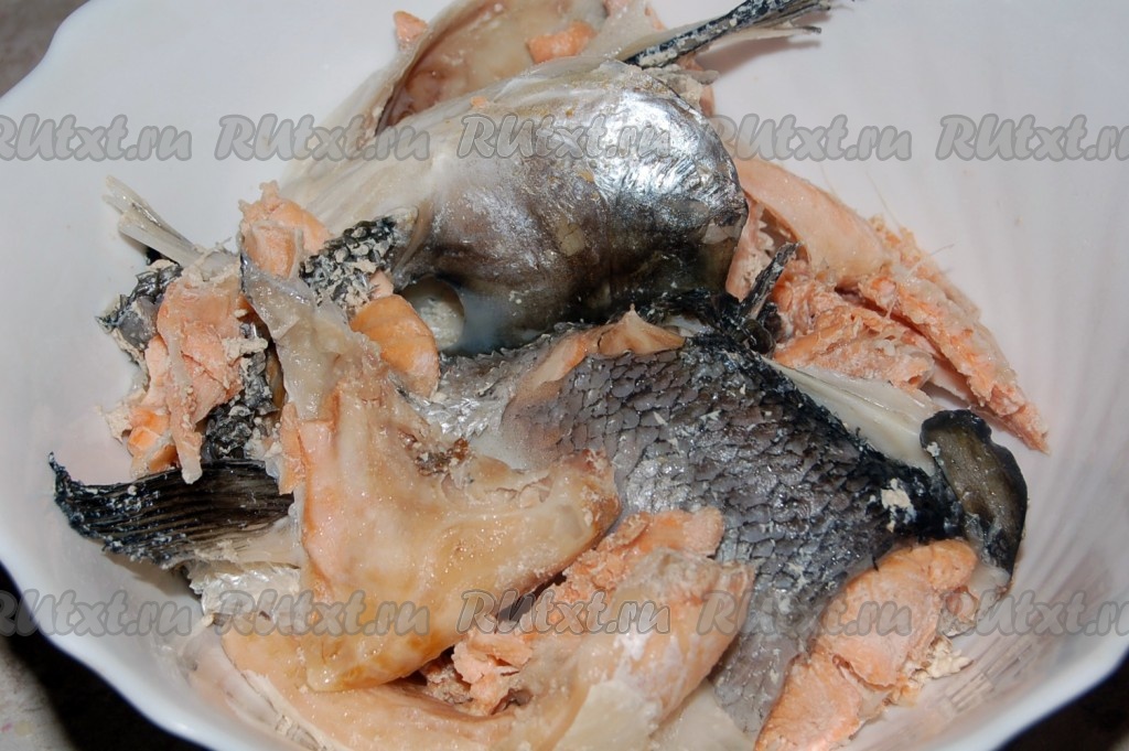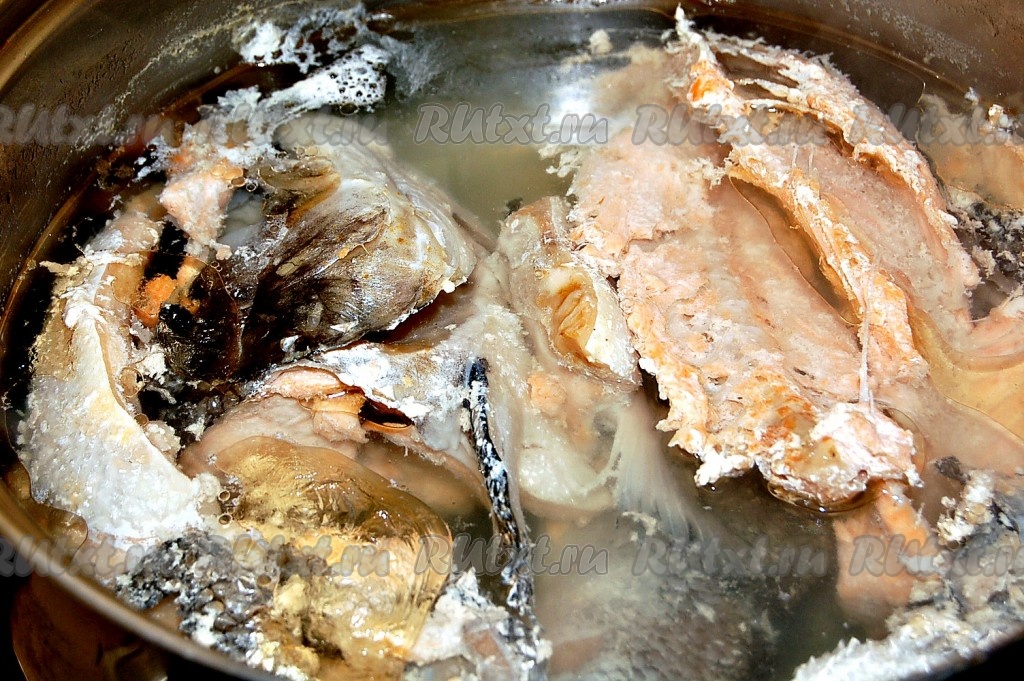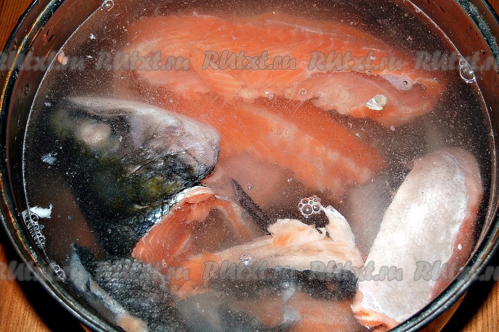 Голову, хребет, хвост семги залить холодной водой и поставить вариться.
