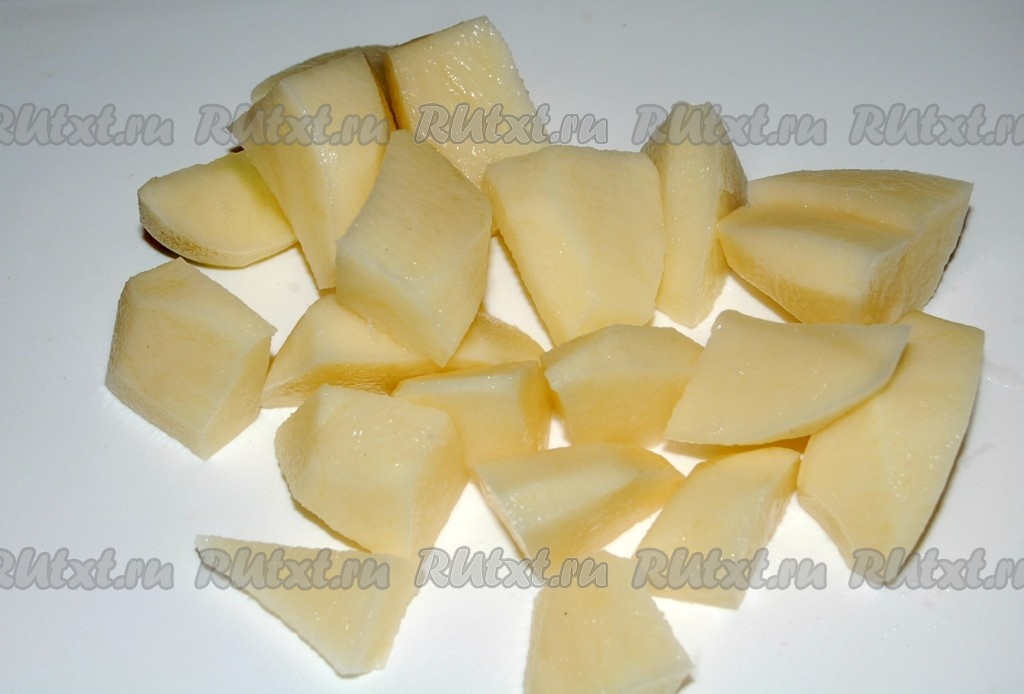 Нарезать картофель крупными кусочками и отправить вариться в бульон.