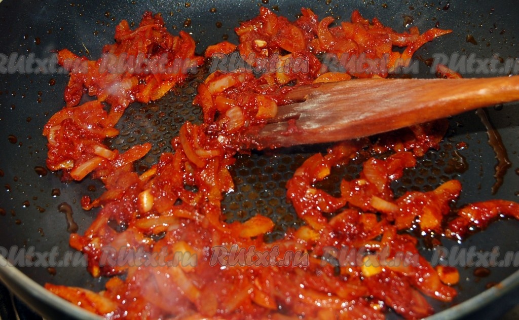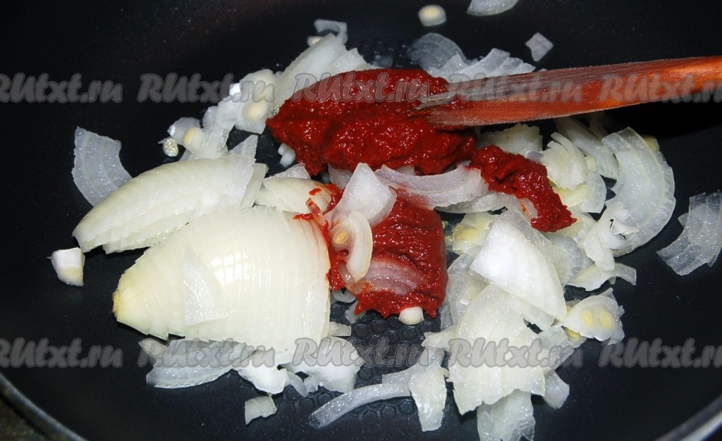 Лук нарезать мелкими кусочками и обжарить с томатной пастой на растительном масле. Жарить минут 15, чтобы цвет обжарки стал более интенсивным.