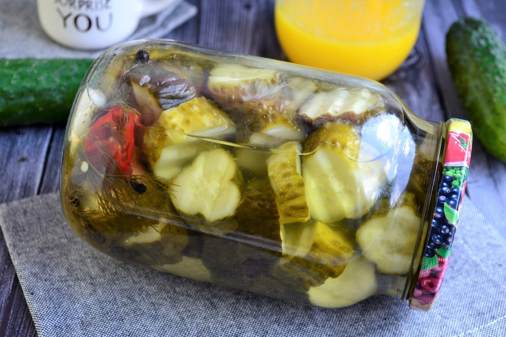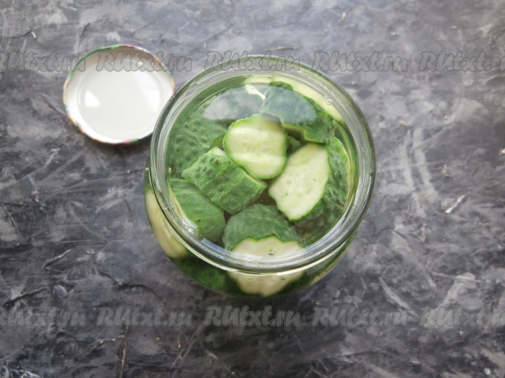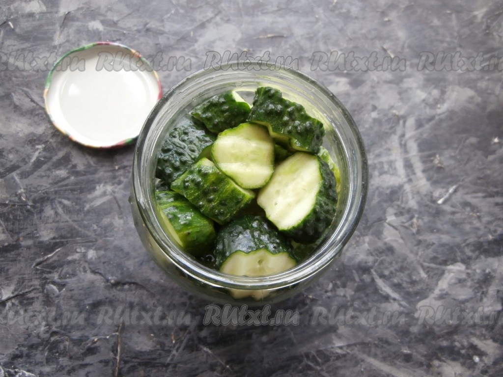 Огурцы предварительно замочить на пару часов в холодной воде, затем помыть их и нарезать кружками толщиной около 1-2 см. Наполнить банку огурцами.