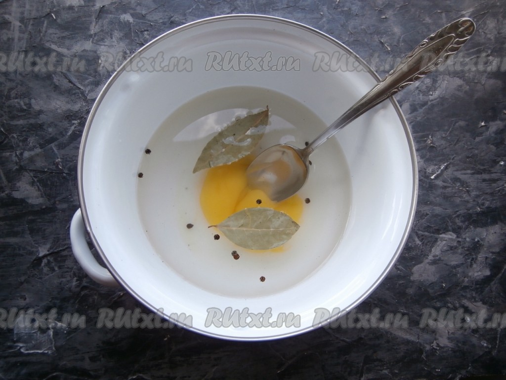 И эту воду слить, а в кастрюлю налить 500 мл чистой воды, добавить соль, мёд, лавровый лист, сахар и чёрный перец горошком, довести до кипения, помешивая.