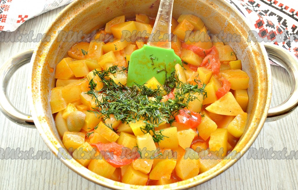 Кастрюлю накрываем крышкой. Перемешивать ингредиенты не нужно. Убавляем огонь и тушим кабачки с овощами и картошкой около 45 минут. Готовое овощное рагу посыпаем измельчённой зеленью (я использовала укроп) и подаём к столу.