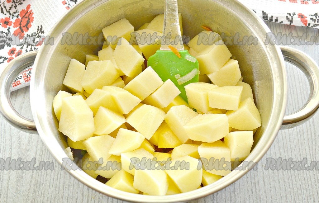 За это время очистим картошку, нарежем на крупные кубики и добавим к овощам.