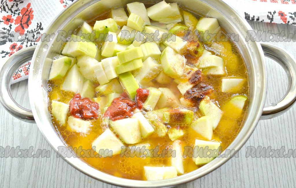 Добавляем томатную пасту, соль, паприку и чёрный молотый перец.